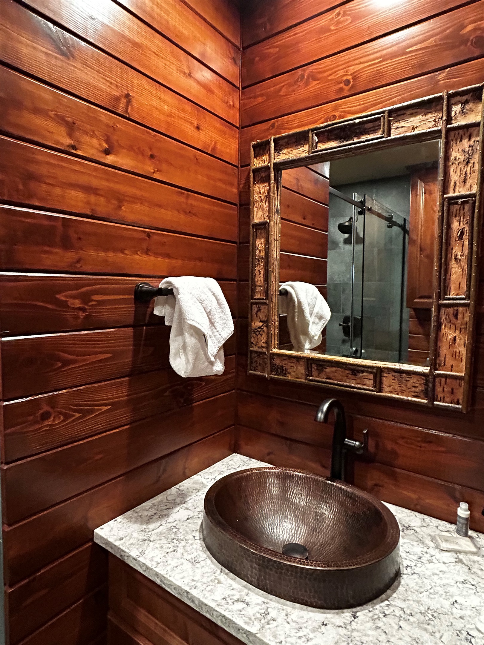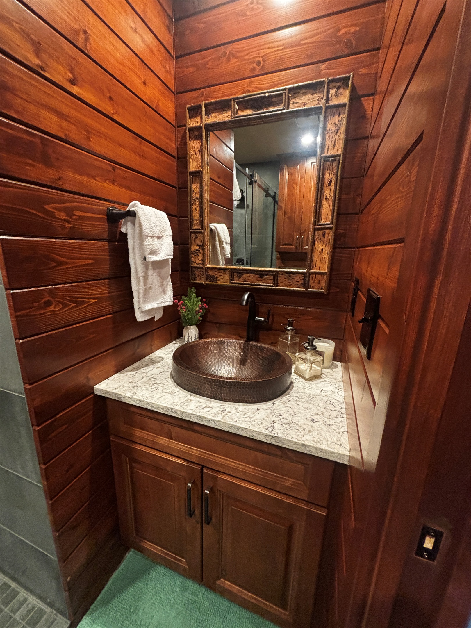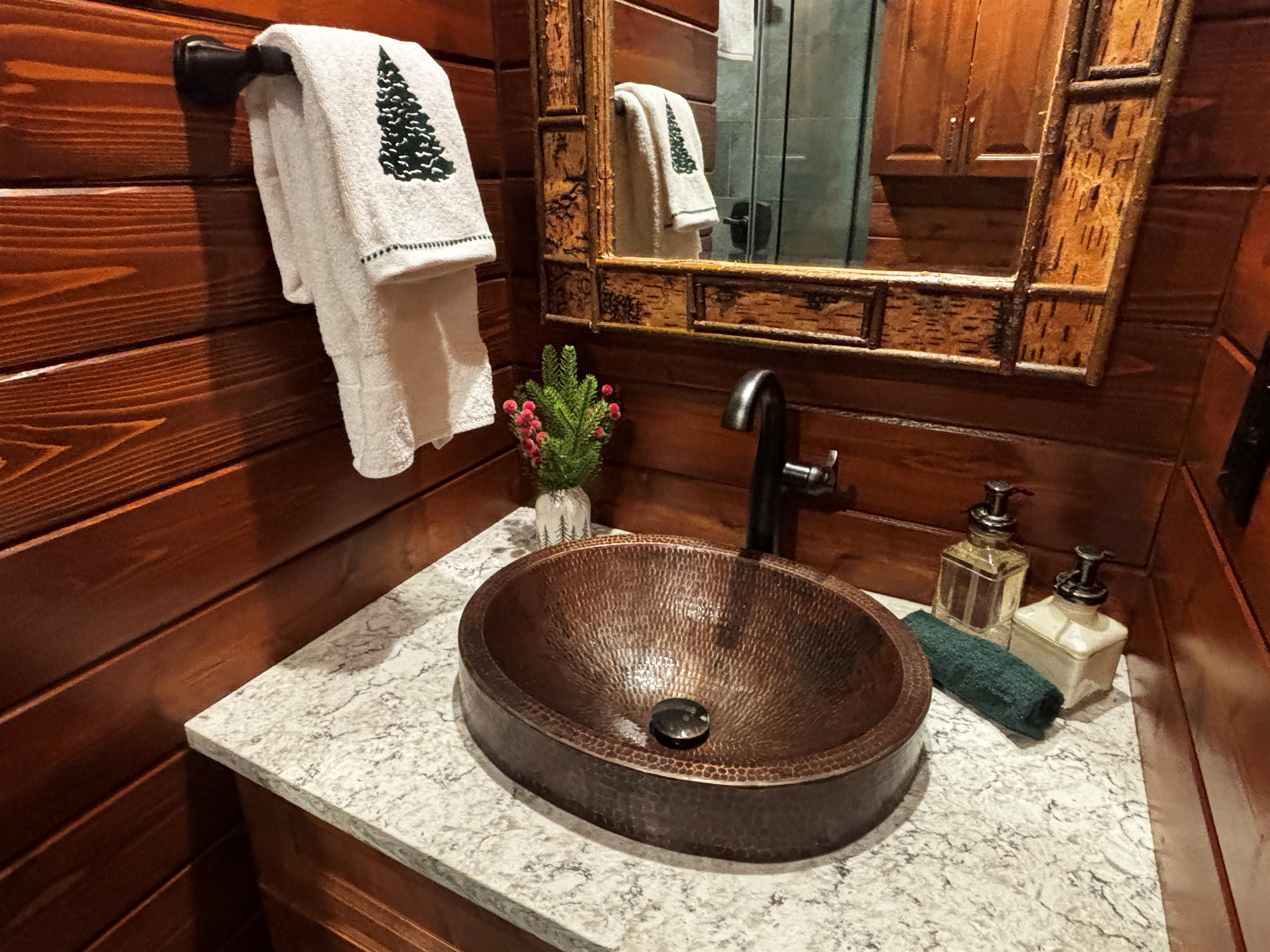 The new main floor bath feels like a private spa, with a dual rain shower accented by natural river rock, a stylish knotty pine vanity with quartz countertop, copper sink, cedar-lined walls, and generous storage.