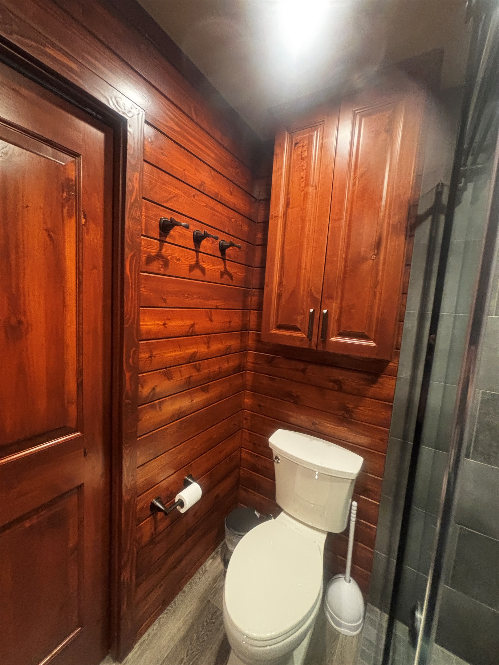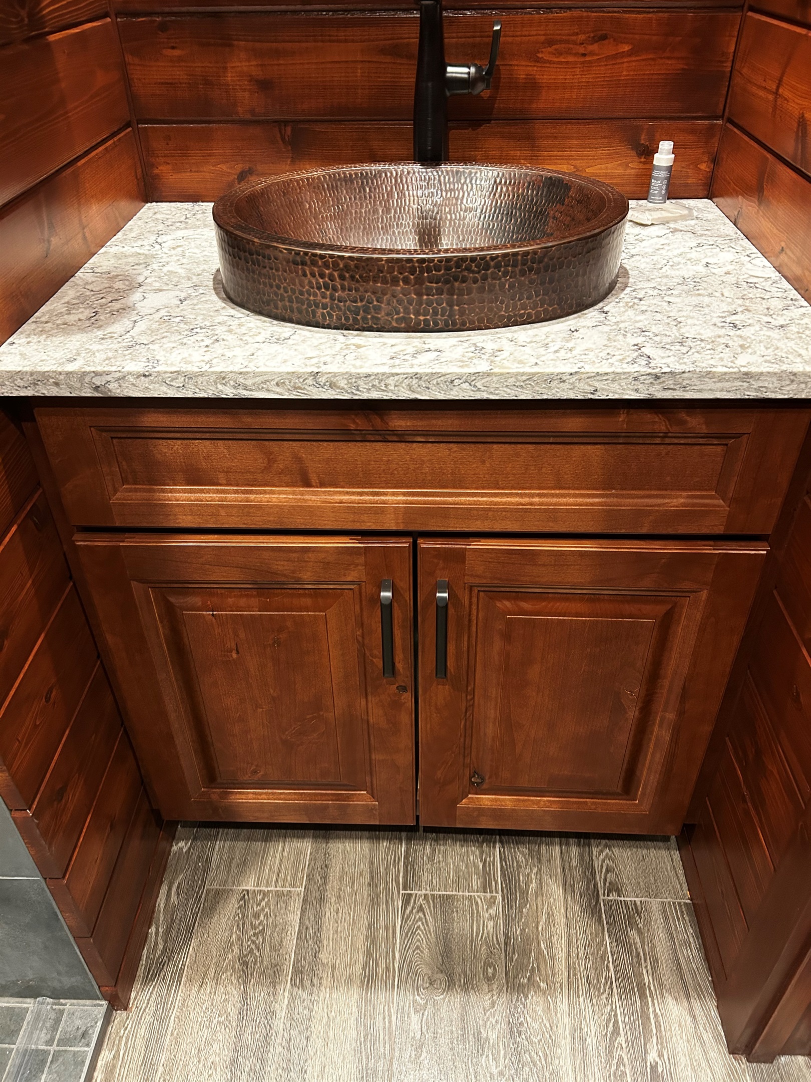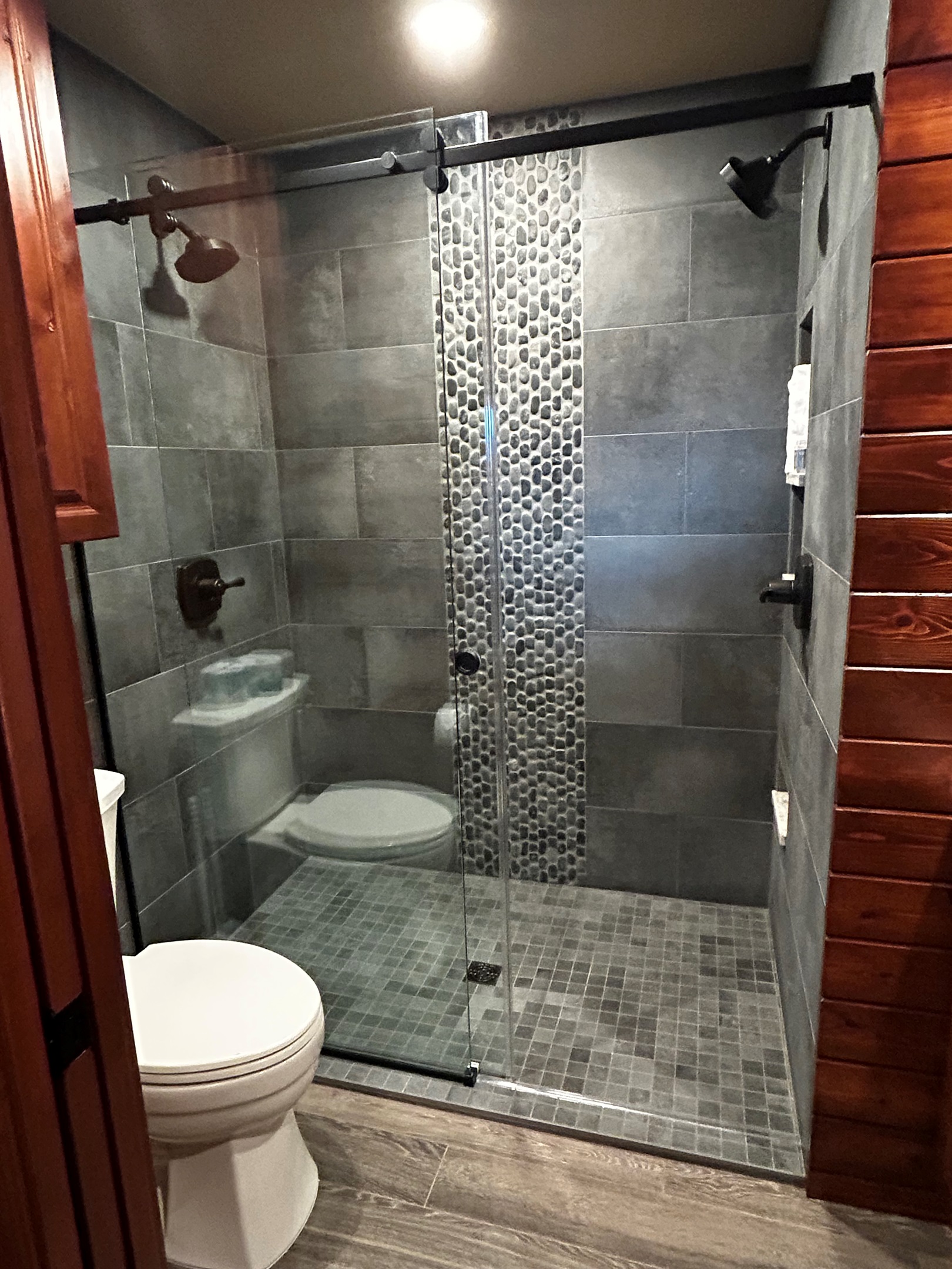 The new main floor bath feels like a private spa, with a dual rain shower accented by natural river rock, a stylish knotty pine vanity with quartz countertop, copper sink, cedar-lined walls, and generous storage.